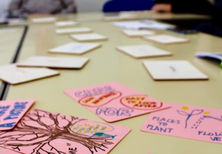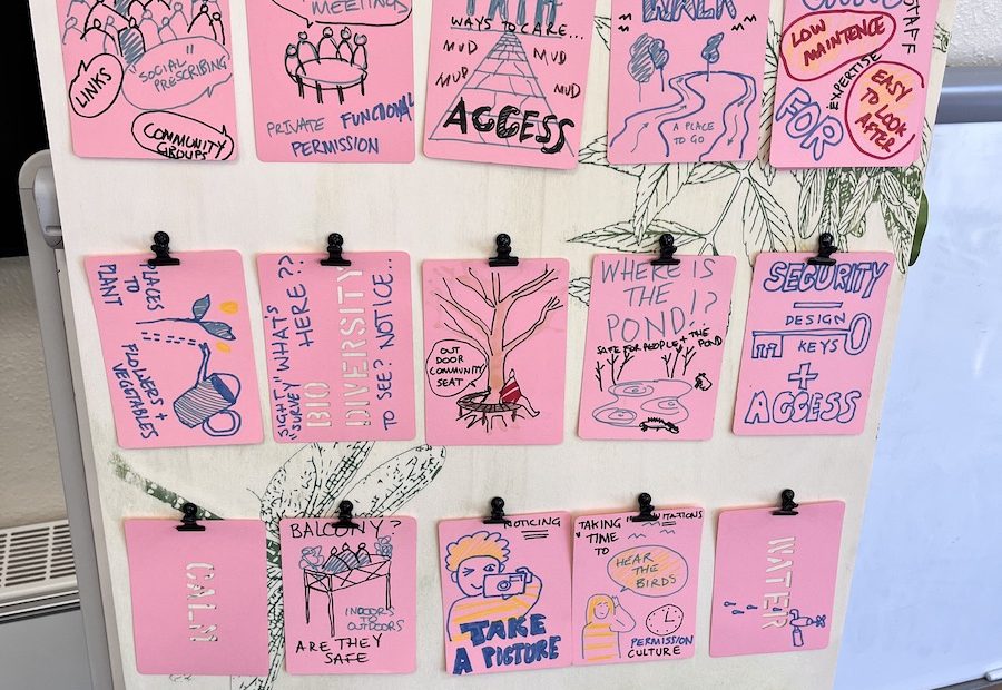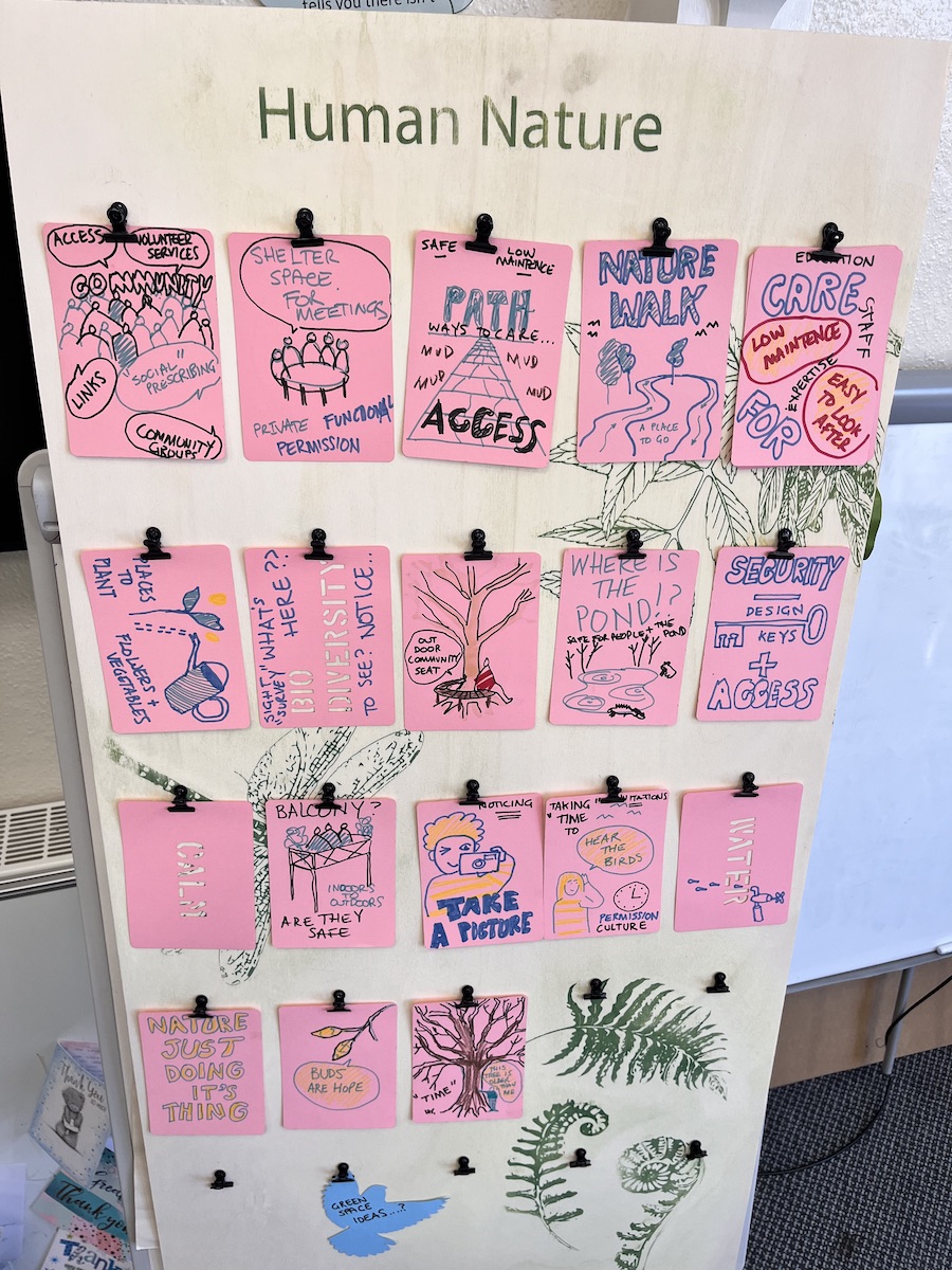 Nick Gant from the University design team created tactile prompt cards using images and words from the book, and others inspired by nature. Interactive workshops facilitated by Culture Shift CEO Julia Roberts helped staff from a range of NHS functions explore their own relationship with nature, and begin to envision outdoor spaces at NHS sites that benefited staff, patients, community and wildlife.